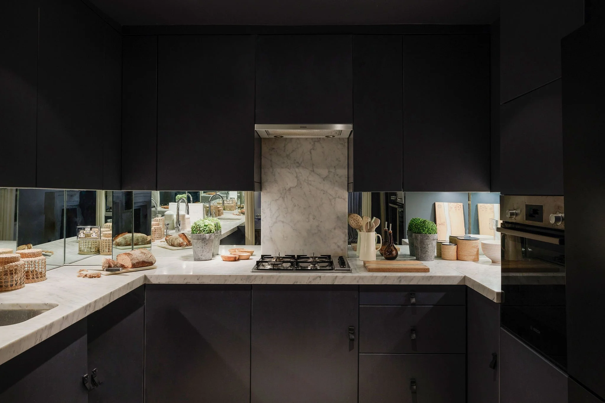 The complete renovation of a penthouse duplex apartment in Chelsea, London. Taking it from a dark and divided property to a bright and spacious home. The only dark element that was embraced in creating the new space is a bold kitchen, painted in Penny Black with a tinted mirror splash back. The effect being a space that doesn’t look like a traditional kitchen, instead it recedes into the background while also creating a fun talking point. The use of a mirror wrapping the kitchen countertops creates a sense of continuity and depth, which further emphasises the dedication to the spread of light in the apartment. This effect is carried on with the mirror TV above the built out fireplace and the glass balustrade on the landing, an area which also features a meticulously planned art gallery wall that connects the two levels.