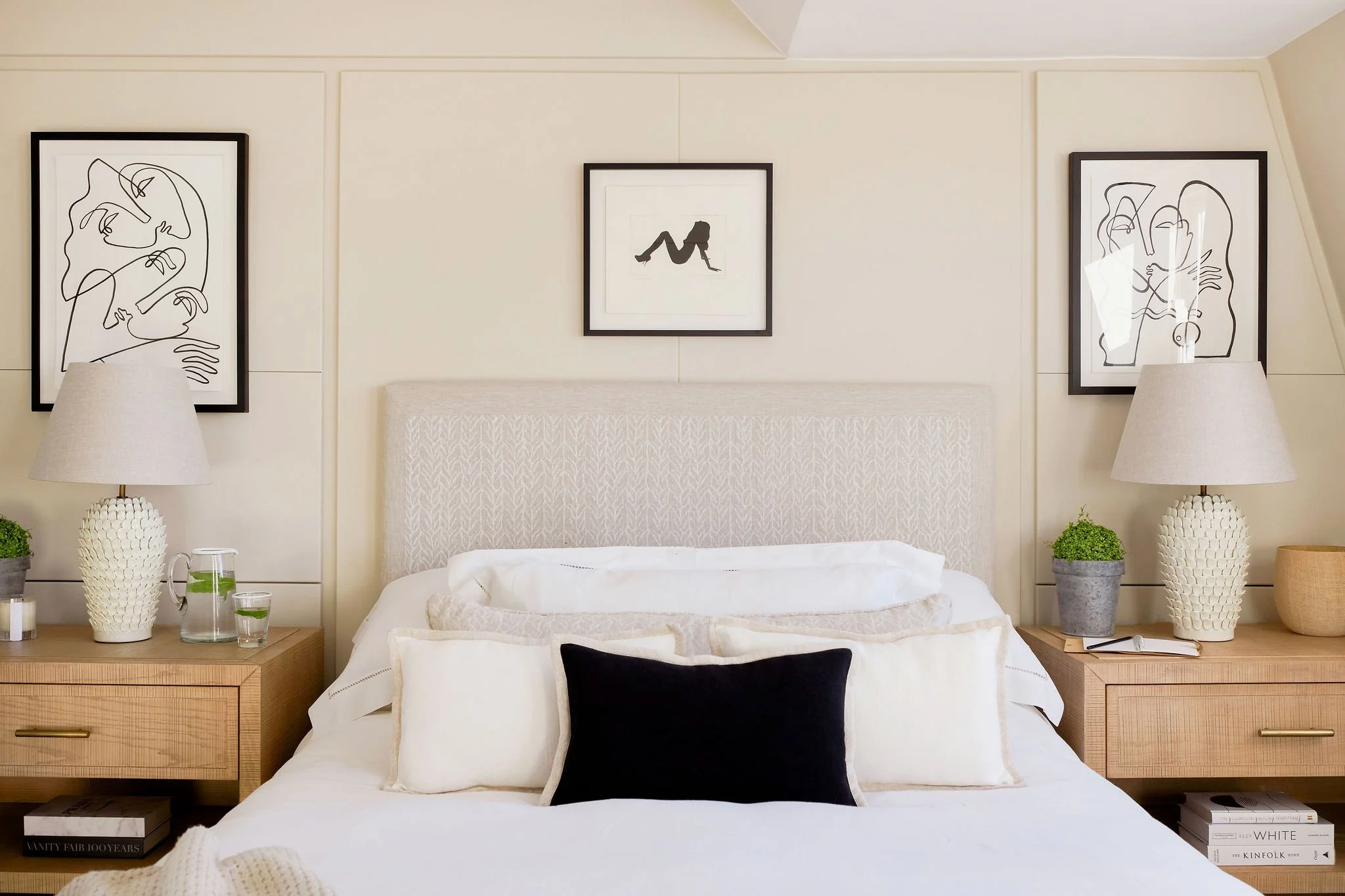 One big issue to overcome on this property was the existing wall boxing out. By building out the TV wall we were able to house a new boiler and by building out the master bedroom headboard wall we were able to conceal an off centre chimney breast. In both instances we utilised joinery to fill the space and transform any lost space into hidden storage, cleverly designed to look like wall panelling which was then clad in linen.