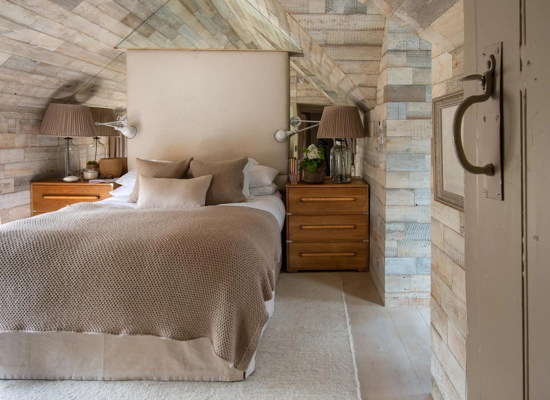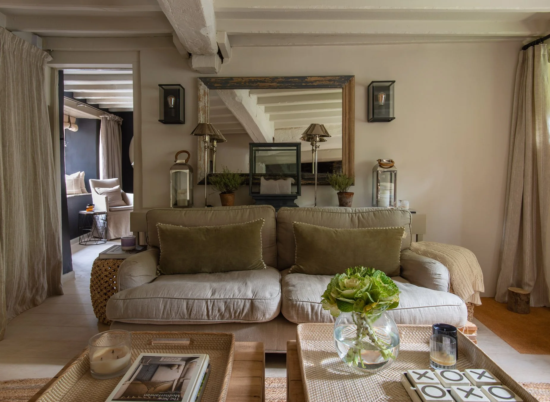 Our focus was to maintain and highlight the existing historical features of the property, such as the original stone walls, low-beamed ceilings, and an inglenook fireplace. We used sympathetic design and materials throughout the renovation, such as raw timber, natural linen, and a refined palette of neutral colours that all nod to the tones found in the local landscape.